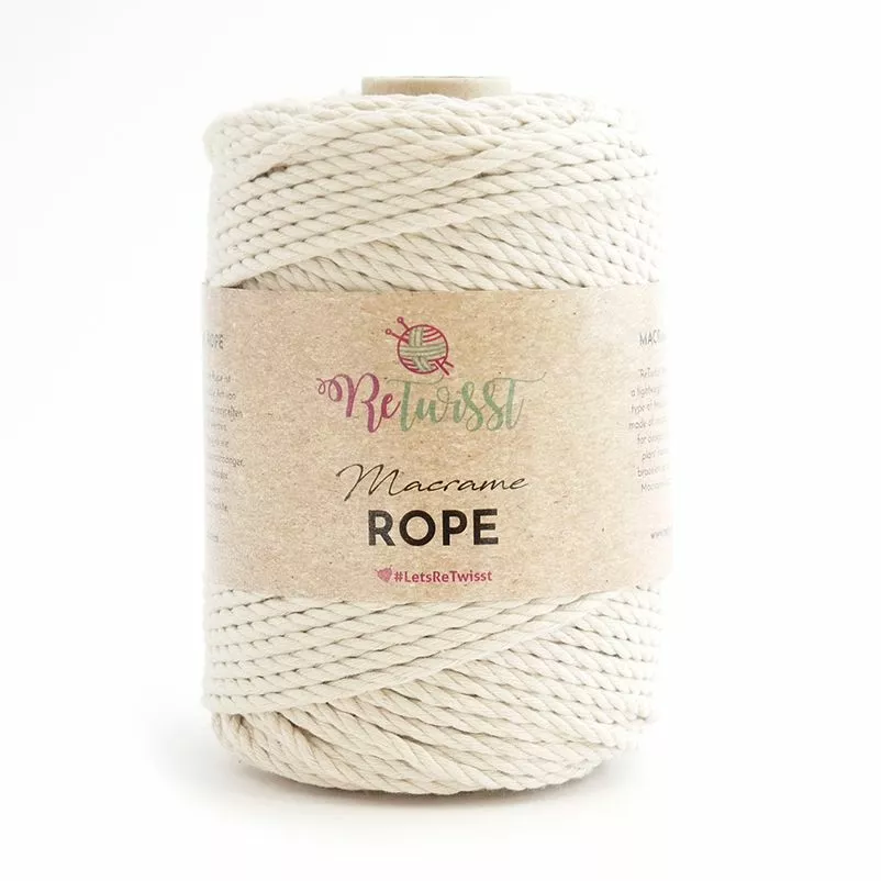 Macrame Rope on 4 mm paksuinen makrameenaru, joka on valmistettu uusiopuuvillasta. Naru sopii hyvin makrameesolmeiluun. Tämä makrameelanka on myös hapsuuntuva.